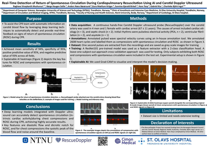 Detection of Spontaneous Circulation during Cardiopulmonary Resuscitation using Continuous Carotid Artery Doppler Blood Flow monitored by AI in an Animal model of Cardiac Arrest". Raghava Vinaykanth Mushunuri et al.
